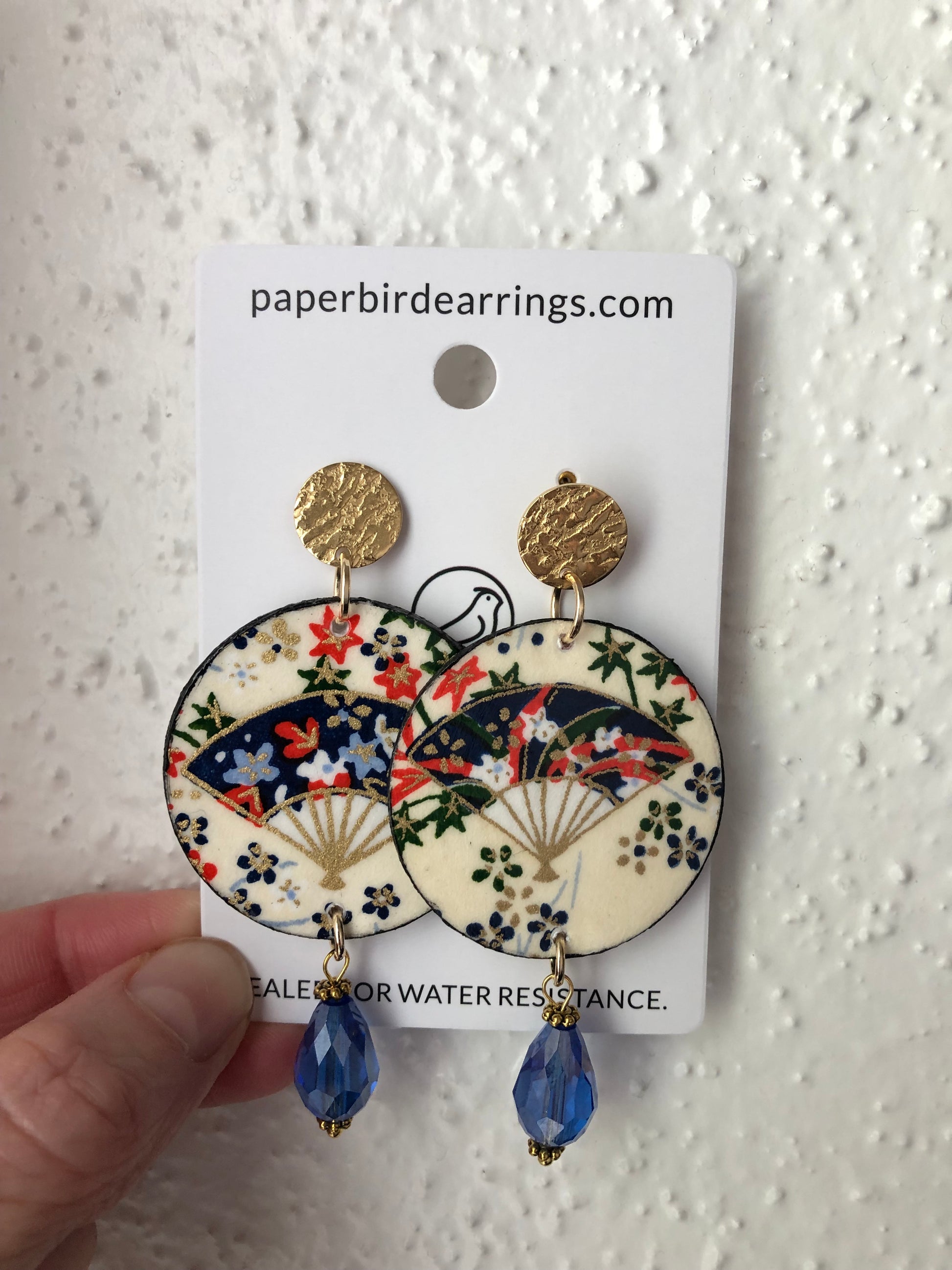Our handmade paper earrings Bamboo fan is crafted using hand silkscreened paper highlighted with gold edging fabricated in Japan. An iconic expression of Japanese artistry.