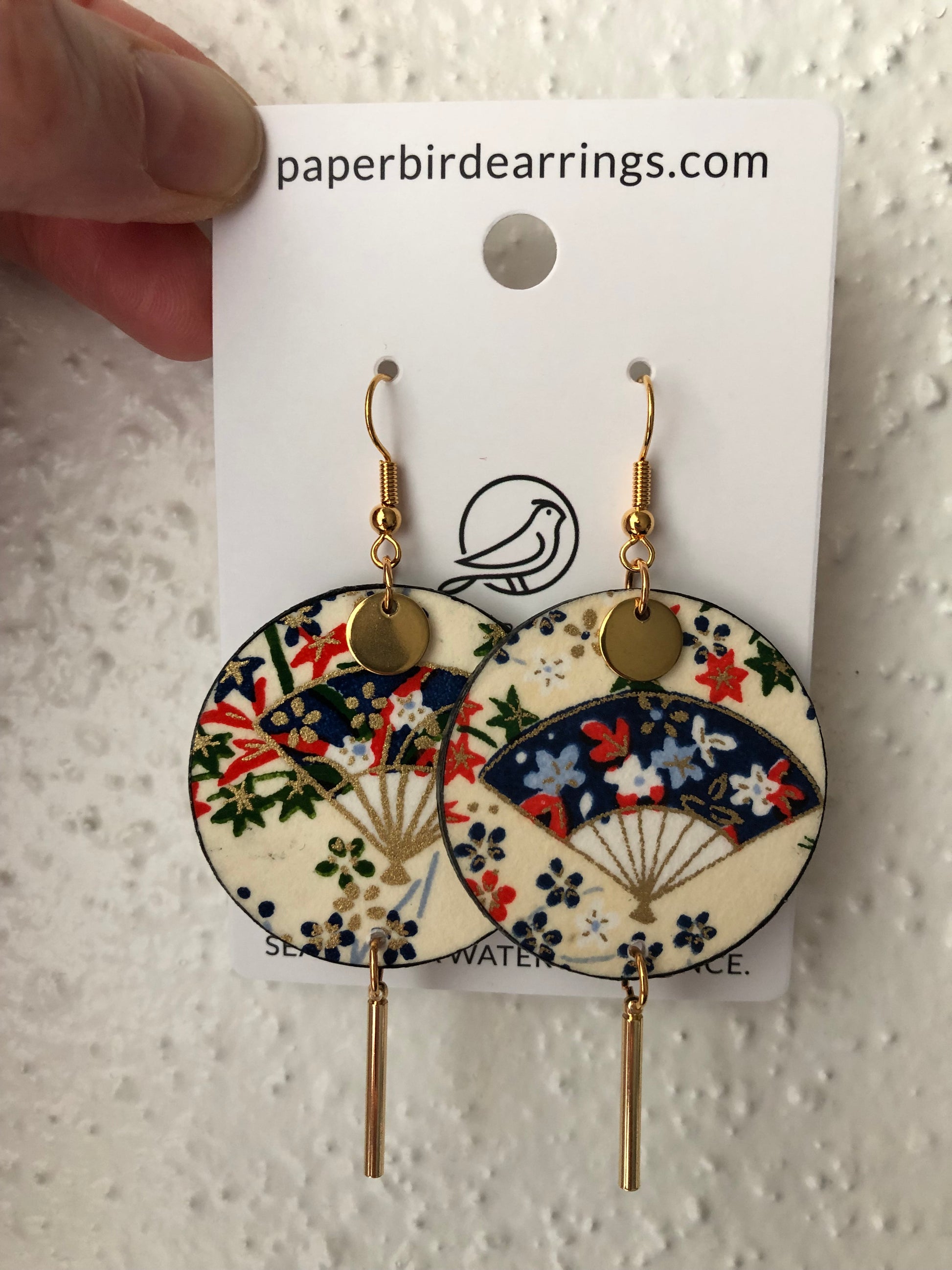 Our handmade paper earrings are crafted using hand silkscreened paper highlighted with gold edging fabricated in Japan. An iconic expression of Japanese artistry.