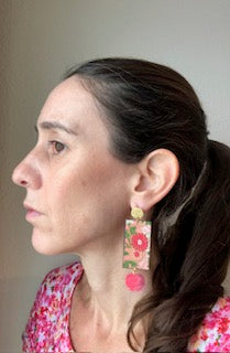 Our flowers with pompom earrings are handcrafted with layers of paper for structure and non-toxic materials, with a double-sided paper design. Coated with a water-resistant sealant.