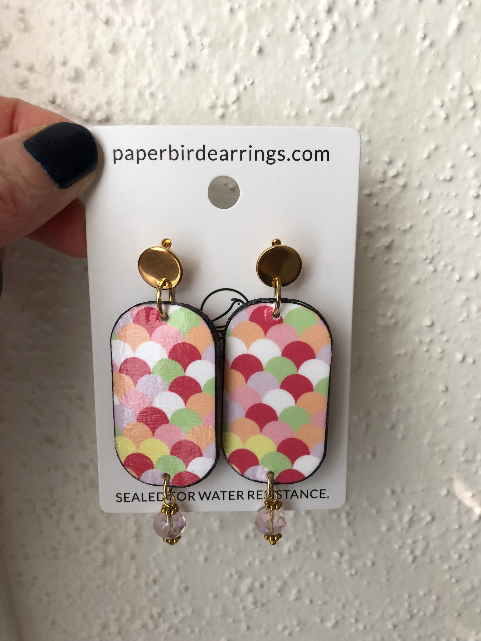 Paper earrings with a colorful twist on the classic Art deco pattern.