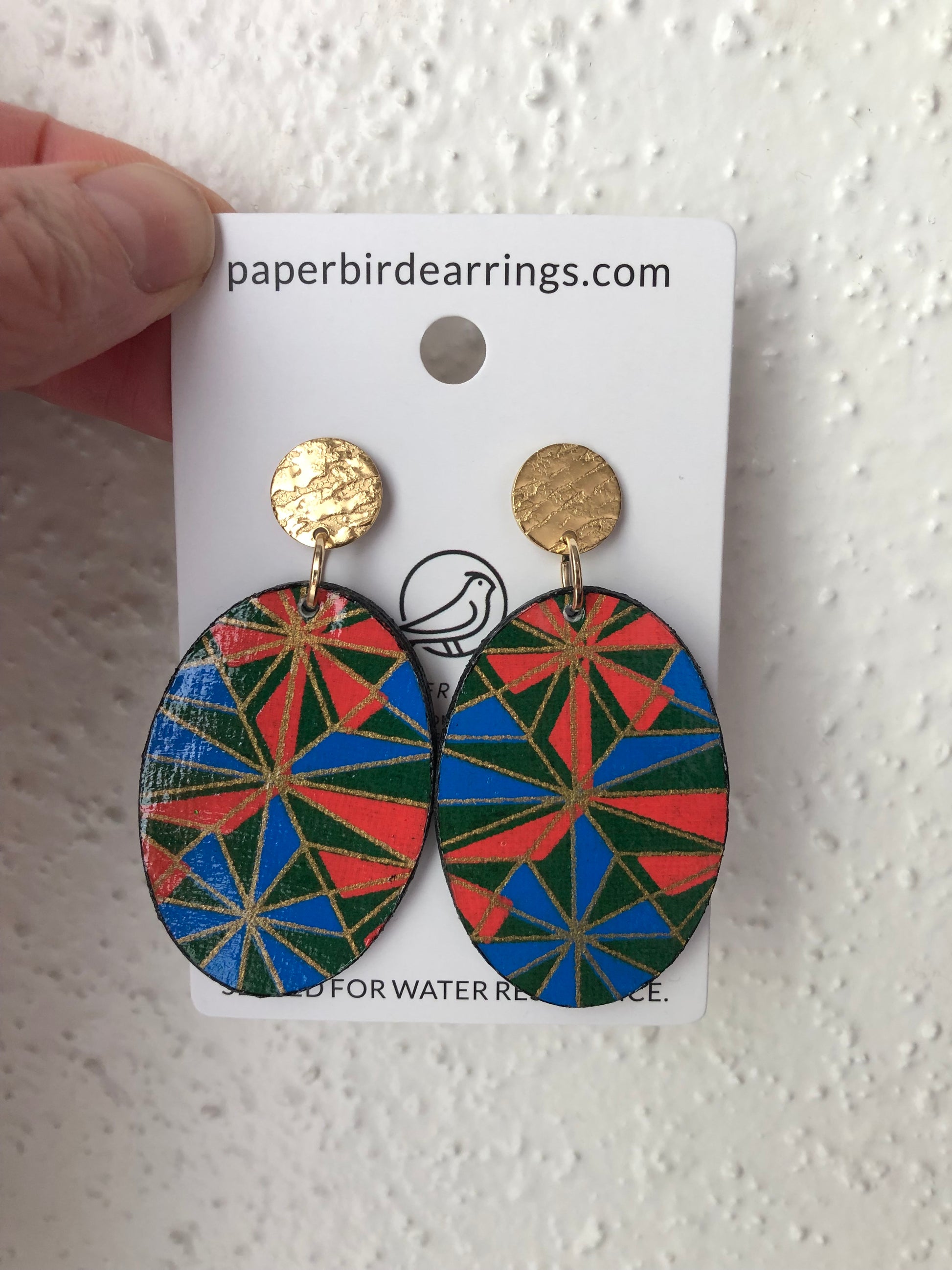 Make a bold statement with these striking oval paper earrings featuring vibrant geometric patterns that demand attention. The distinctive design transforms any outfit into an expression of fearless style.
