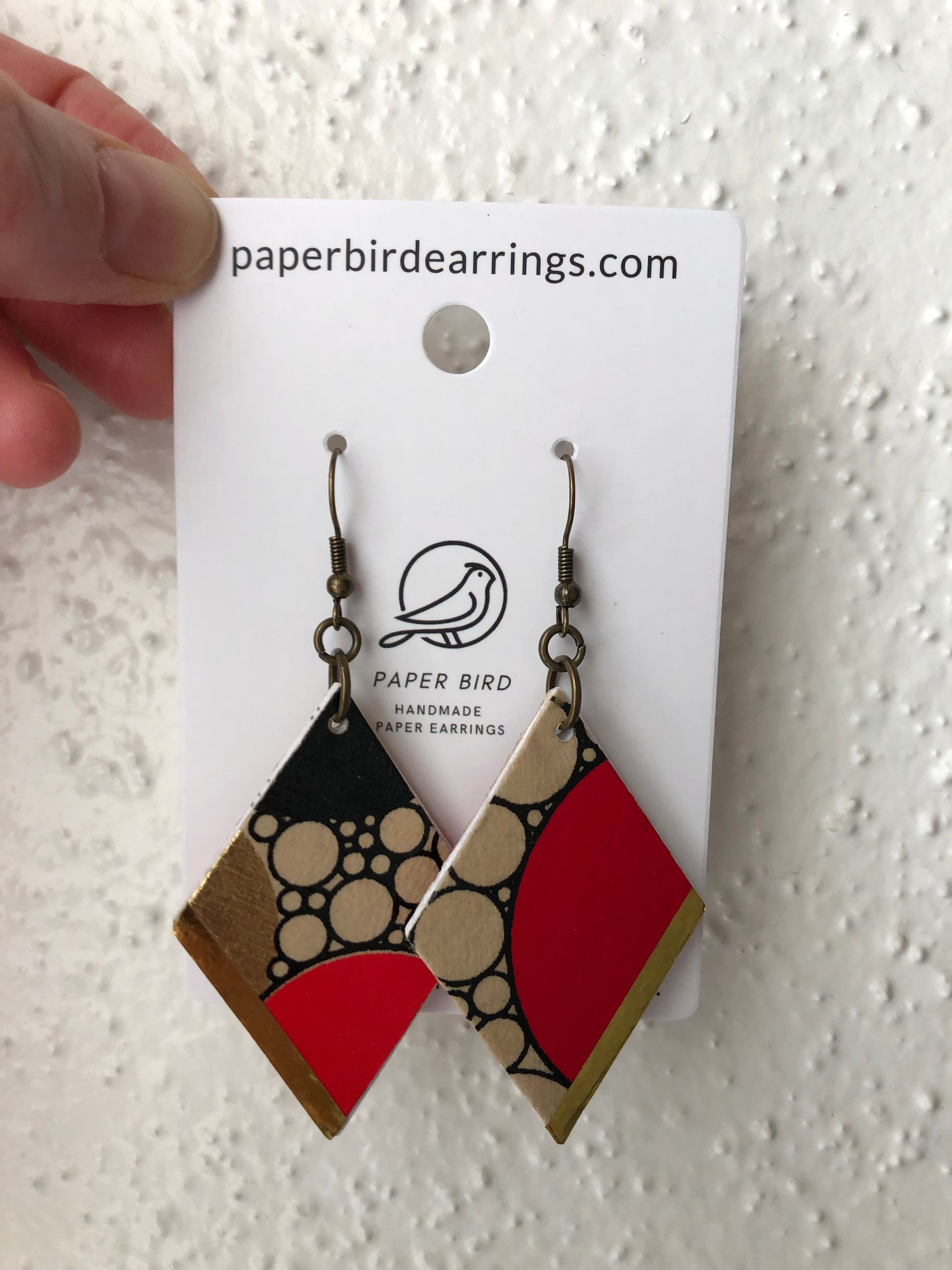 Make a statement with these red, black and gold geometric rhombus paper earrings. These earrings will let you stand out, making any look pop.