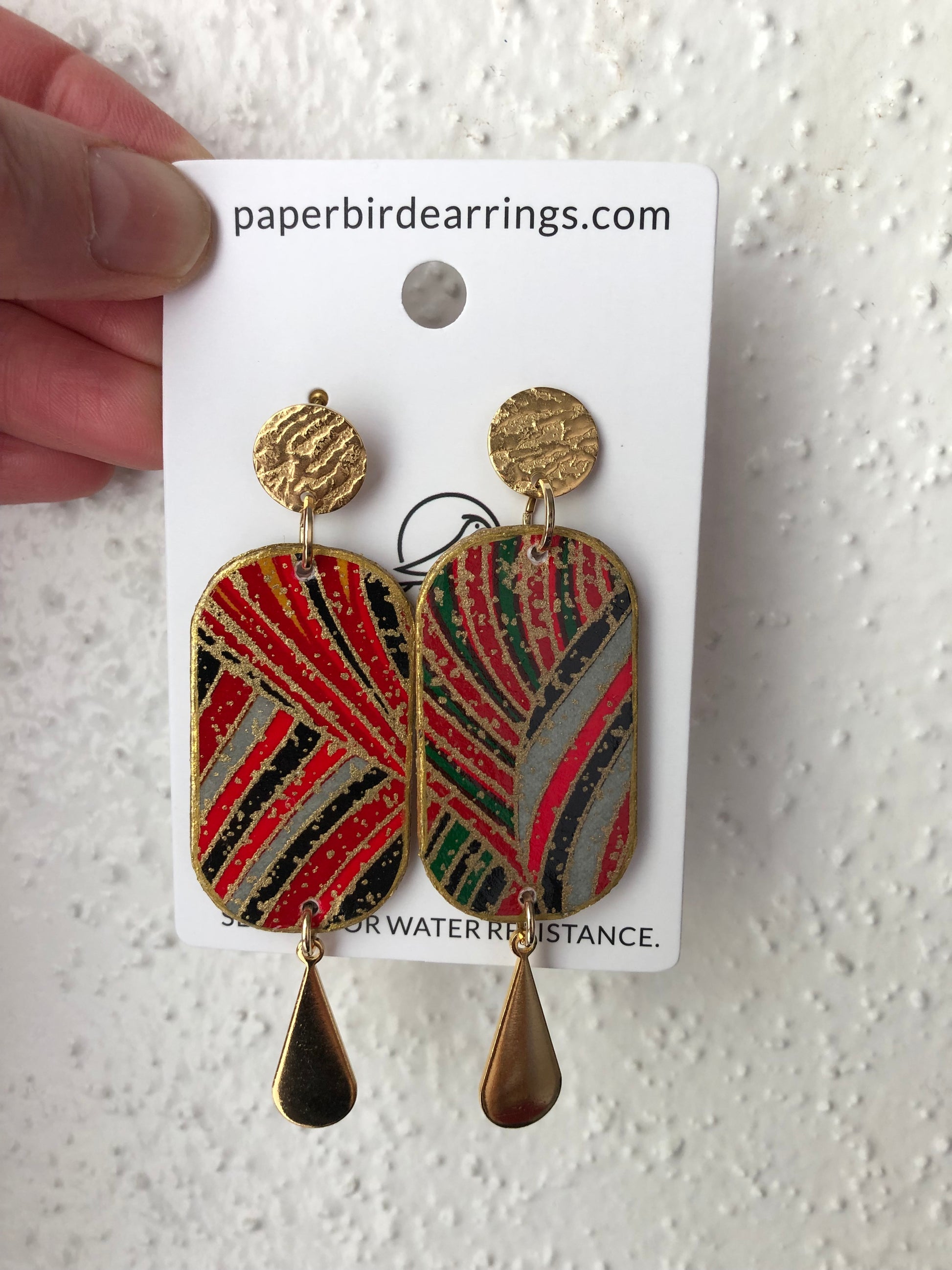 Japanese paper pattern inspired by majestic colorful hills in nature (like Denali mountain peak in Alaska) in a gold red and green color. Make a statement with these unique and vibrant paper earrings.