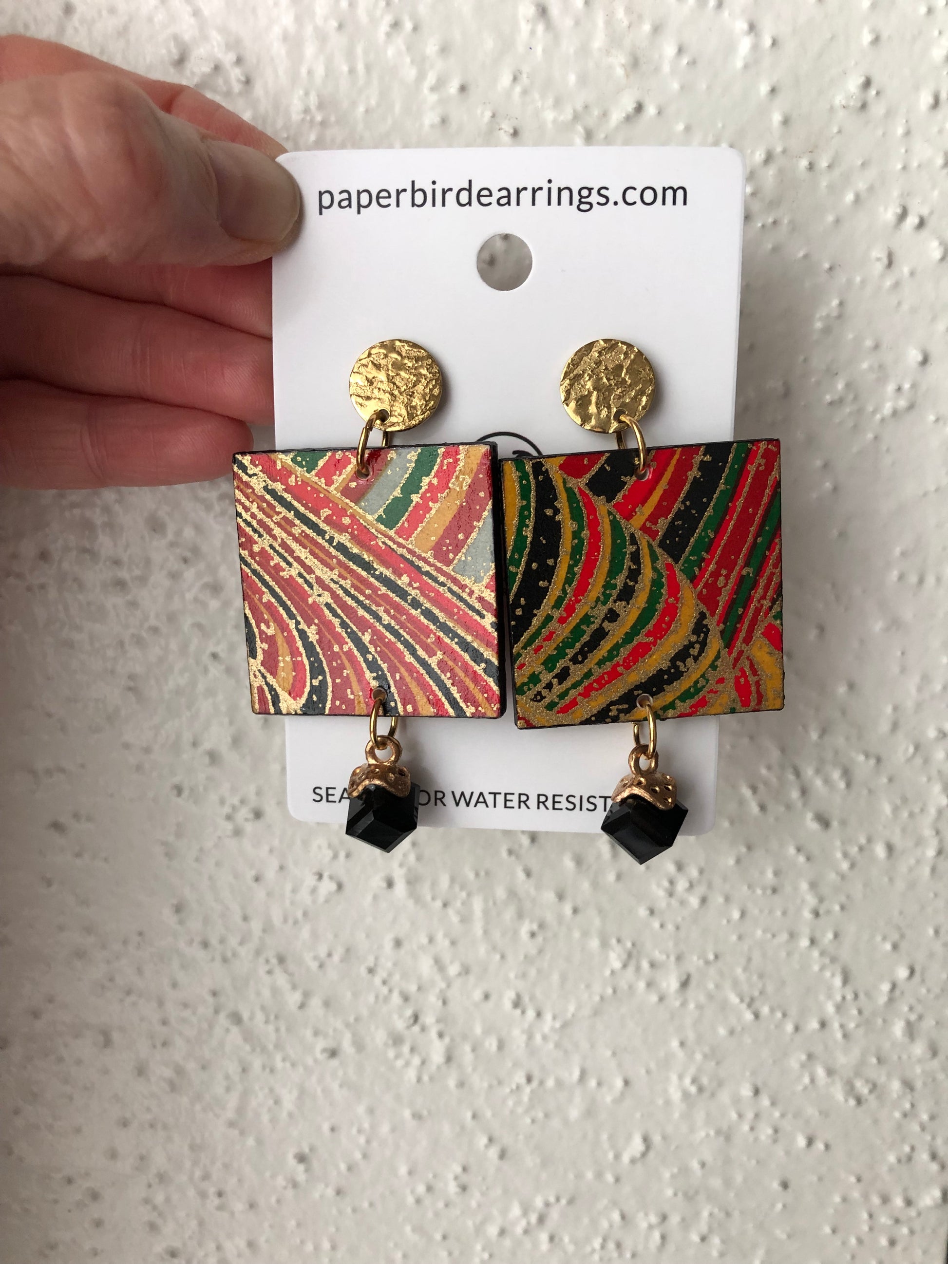 Majestic hills paper earrings are made with japanese paper pattern inspired by majestic hills in nature (like Denali mountain peak in Alaska) in a gold red and green color.