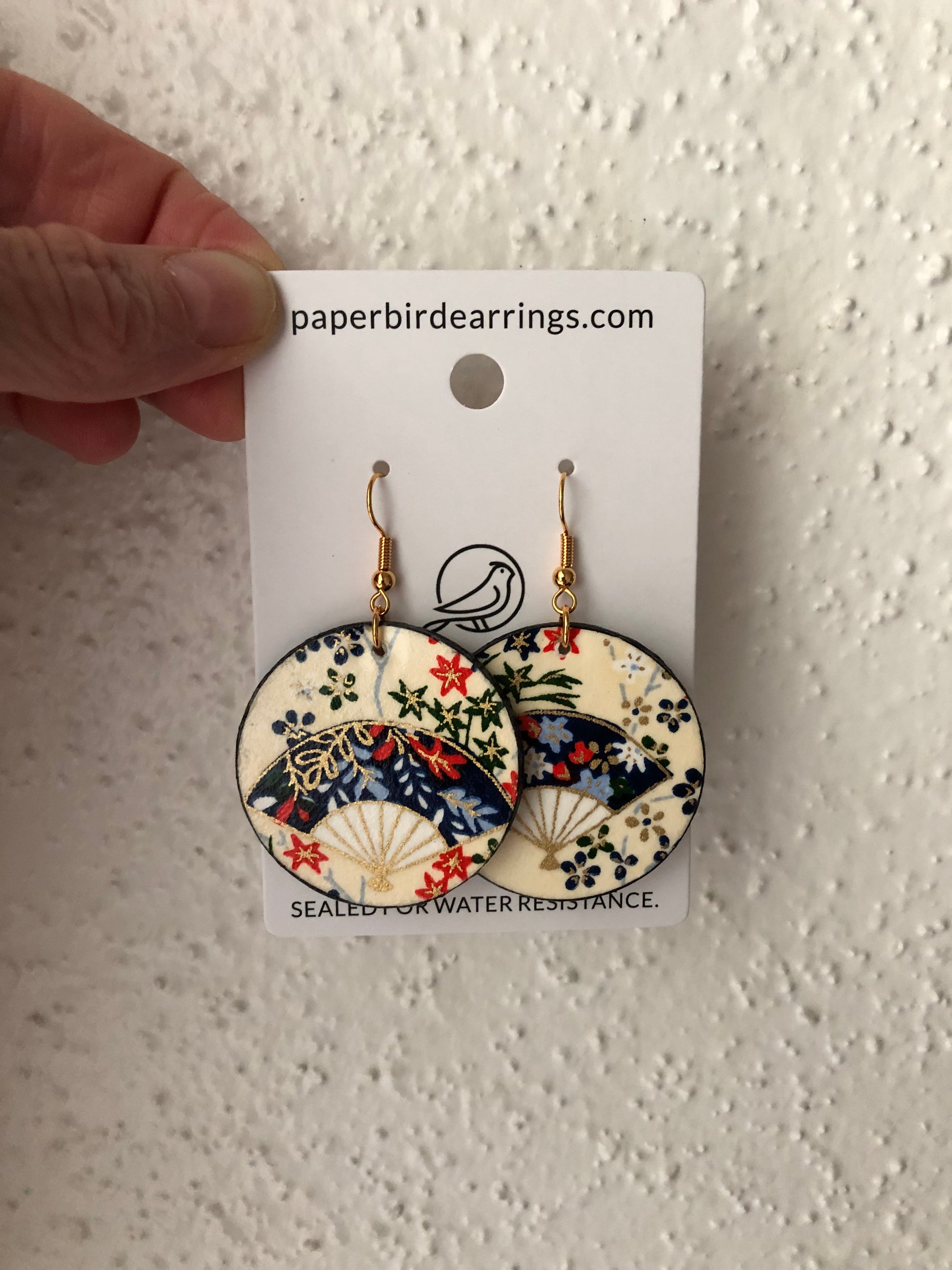 Our handmade Sensu fan paper earrings are made of Japanese hand silkscreened paper highlighted with gold edging.